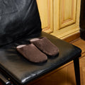 slipper van The Row in de kleur laquer brown in het materiaal suede